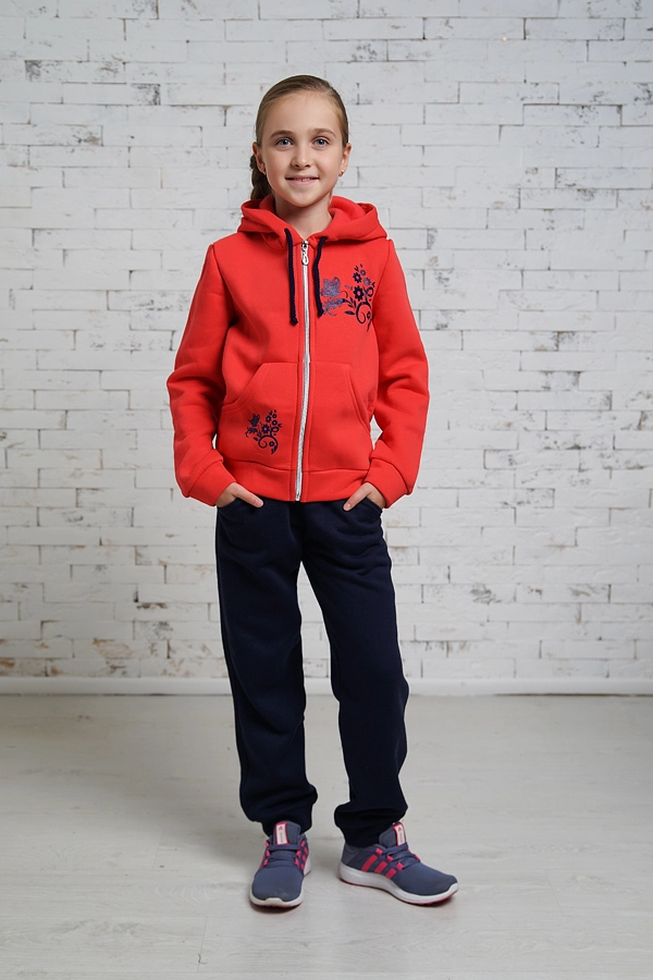 коралового цвета,штаны-тёмно синего.Материал-трикотаж