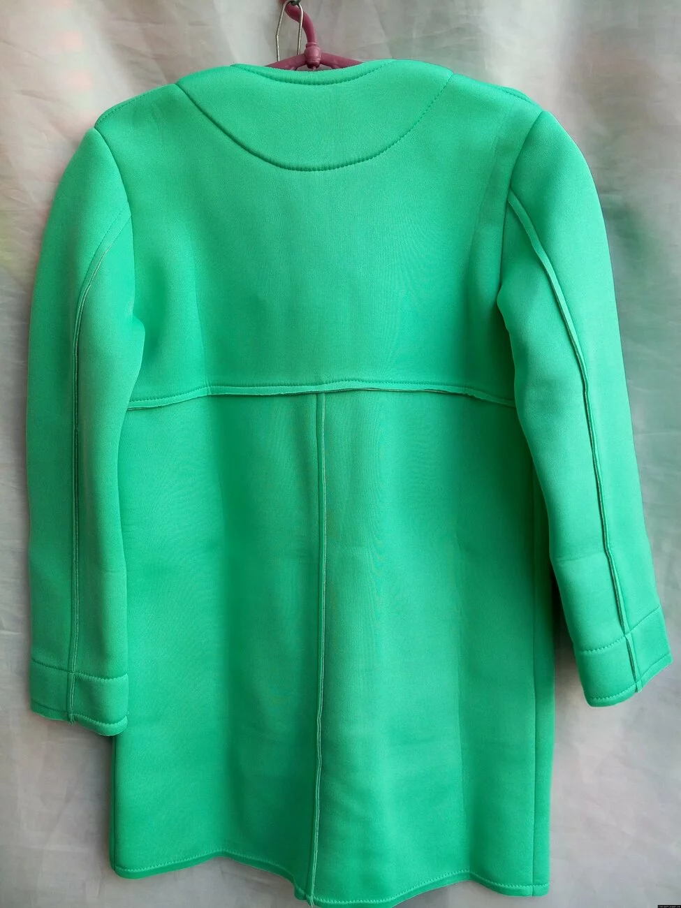 Подростковое пальто из неопрена,мятного цвета. Отличное качество,внутри на х/б основе.Прекрасно будет смотреться на детях возрастом от 7 до 11 лет.