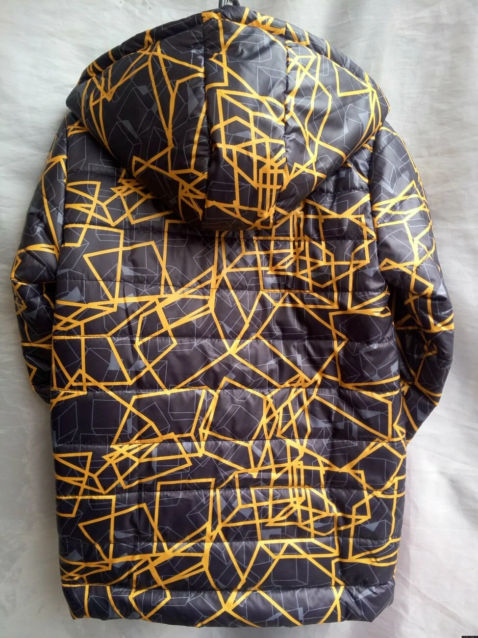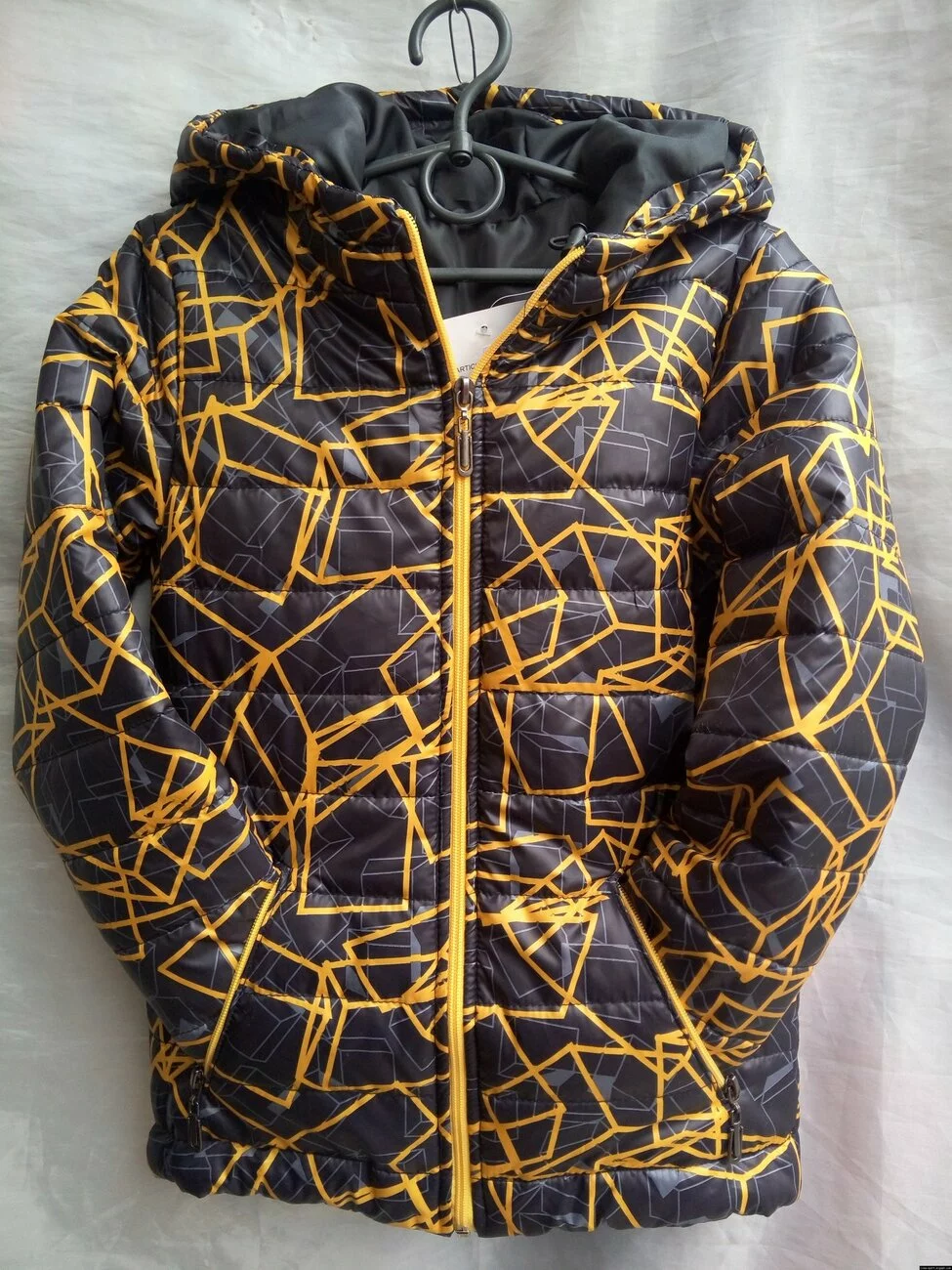 Демисезонная подростковая ветровка для мальчиков чёрного цвета с жёлто-серыми разводами.Материал-плащёвка,наполнитель 150й синтепон,подклад-нейлон.Отличное качество материалов и пошива.