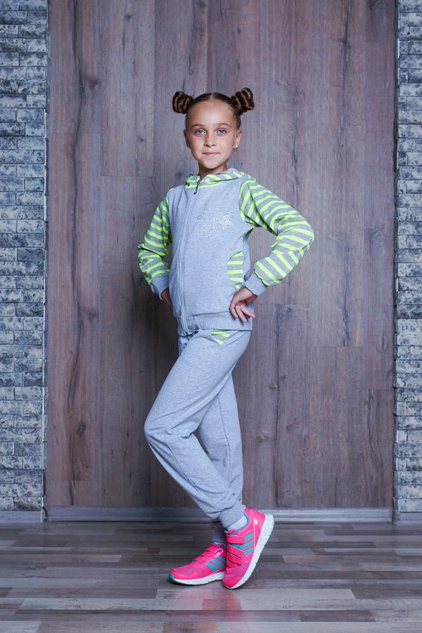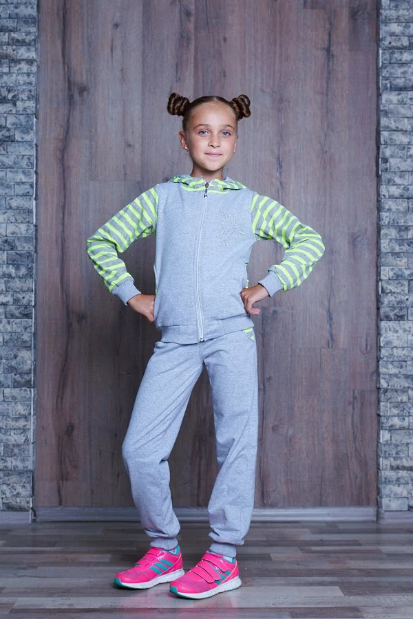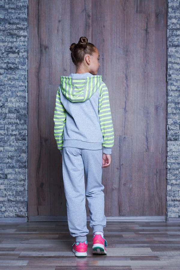 Спортивный подростковый костюм для девочек с капюшоном.Светло-серый костюм с вставками из полосок ярко-салатового цвета,отличного качества,материал-трикотаж двунитка.Этот костюм прекрасно подойдёт девочкам подросткам возрастом с 7 до 11 лет. Данную модель можно использовать как в повседневной жизни так и для активного занятия спортом на природе или в закрытом помещении.