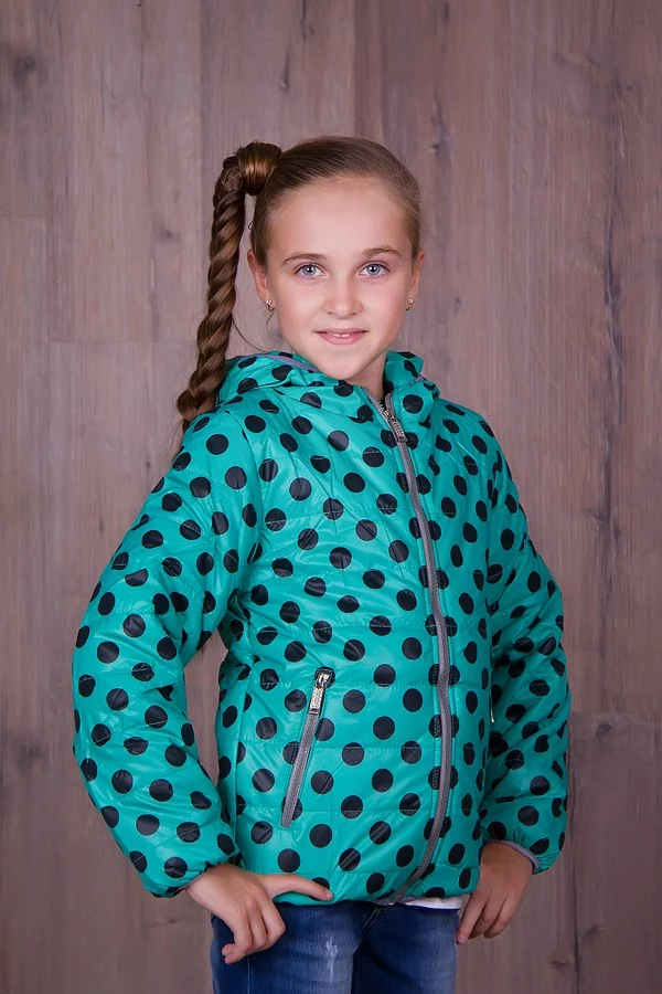 Демисезонная подростковая ветровка для девочек,мятного цвета в тёмный горох. Материал-плащевка,наполнитель-150й синтепон,подклад-нейлон.Отличное качество материалов и пошива.