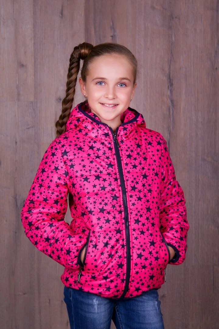 Демисезонная подростковая ветровка для девочек,кораллового цвета в мелкие синие звёздами. Материал-плащевка,наполнитель-150й синтепон,подклад-нейлон.Отличное качество материалов и пошива.