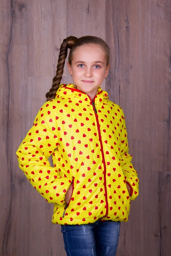 Демисезонная подростковая ветровка для девочек,жёлтого цвета в мелкие красные сердечки. Материал-плащевка,наполнитель-150й синтепон,подклад-нейлон.Отличное качество материалов и пошива.
